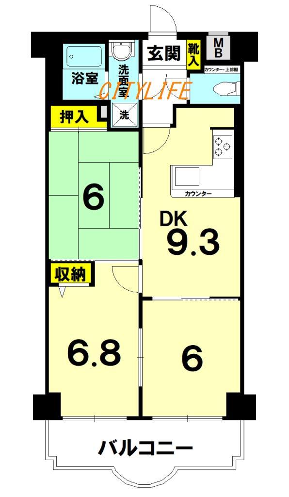 - バス・トイレ別,温水洗浄便座,洗濯機置き場,洗髪洗面化粧台 ,給湯,ガスコンロ,カウンター付キッチン,システムキッチン,バルコニー,オートロック,インターネット,バイク置き場あり,駐輪場あり,南向き,上層階