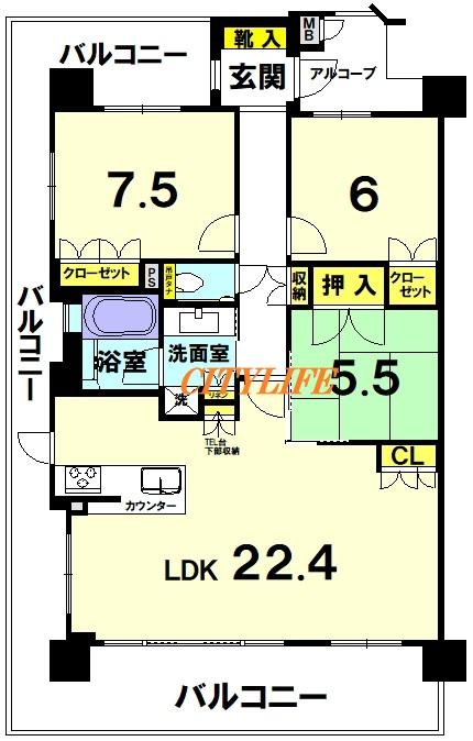 ※上層階・三方角部屋(3面バルコニー)